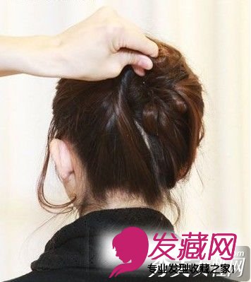 左下方的1/3头发向发包的方向拧成小卷,固定在发包左侧。