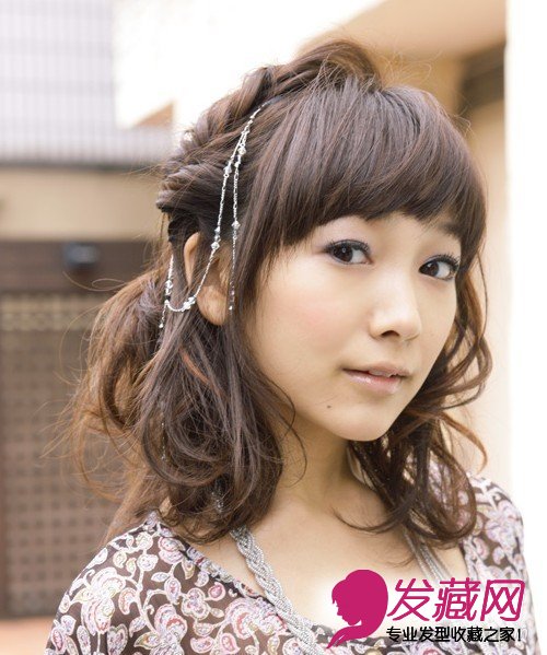 脑后上半部分的头发绑成辫子收拢在左侧,再稍稍挑起一些碎发。剩下的部分保持原有的风格。发尾用卷发器烫出卷度的话会比较有女人味哦!
