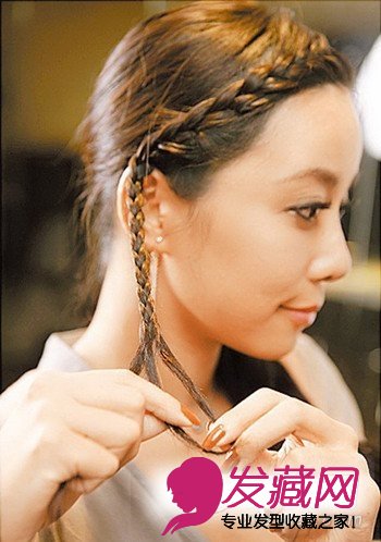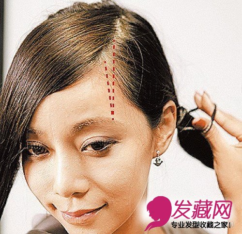 头发左侧分,分线约对齐左眼尾,头顶发丝预留,剩余头发往左绑成低垂的斜马尾。