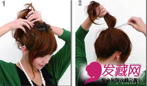 Step1将刘海的部分留出,其余头发抓蓬松,用手向后梳拢。如果发量少的MM可以以逆梳的方式增加头发体积,让后面梳成的苞苞看起来更大。