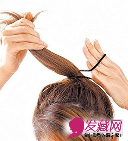 将浏海留起,其余发丝用手指抓梳成高马尾使线条自然,并用橡皮圈固定。用手指将马尾发束逆梳使发丝蓬松。