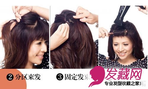 4.以圆筒梳把刘海卷起,吹风机从上往下吹整,呈现漂亮圆弧弧度。