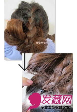三股辫拉到盘发中间,其发尾固定好。