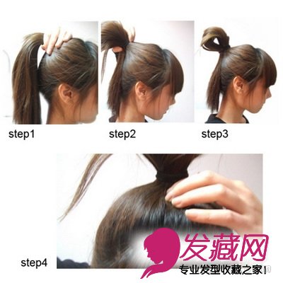 把头发高高的梳起一个马尾,并握起一个拳头大的发箍,用皮筋固定,然后把马尾上的头顶中间部分的头发挖一个小洞。