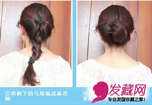 然后将剩下的辫子编成麻花辫,将编好的麻花辫从上卷到里面。