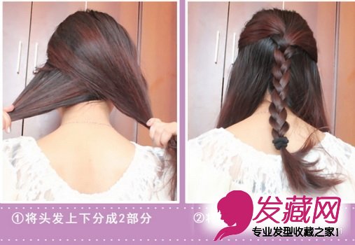 将头发分成上下两个部分,上面的部分编成麻花辫。