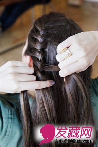 编蜈蚣辫的时候,每次挑起左侧的一小缕发丝加入正在编的发辫中。编至发辫需要转向右侧的时候,开始每次加入右侧的一小缕发丝加入发辫中,并且将发辫的右侧稍稍收紧,这样可以将发辫慢慢引向右侧。