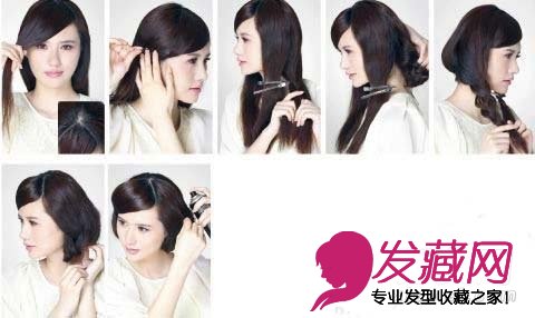 1.(如图)在头顶分出一个三角区。根据自己对刘海儿长度的喜好不同,在颧骨位置或眉峰处将分出来的头发用发圈固定。