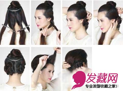 7.将打毛过的头发全部拢到后面,并把发尾向内收卷起来。稍作调整后用发卡固定好,造型完毕。