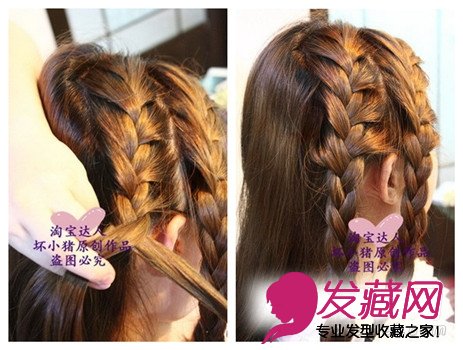 3、在原先头顶分出发片旁边的位置在分出一份发片,同样以三手辫加编的手法往下扎。扎至尾端后用橡皮筋固定。