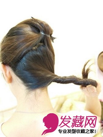 把上半部的头发用夹子固定,然后把下半部的头发扭转。