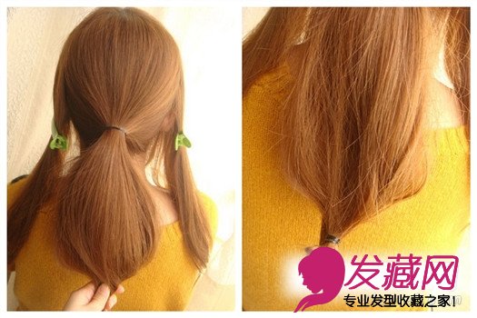 4.刮好后将马尾剩下的头发放下,包裹住刮蓬的头发,抓紧马尾。将马尾用黑色皮筋固定。