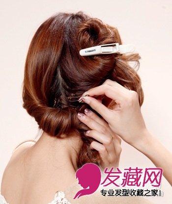 将左后侧头发向右侧拧卷,头发呈发辫状。再将卷好的头发用发卡固定在发际线处,注意蓬松度,要有空气感。
