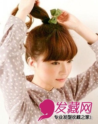 step 2、用皮筋在头顶出尽量高的位置扎一个马尾,再扎上一个可爱的绿色蝴蝶结装饰在马尾上,增加可爱感。