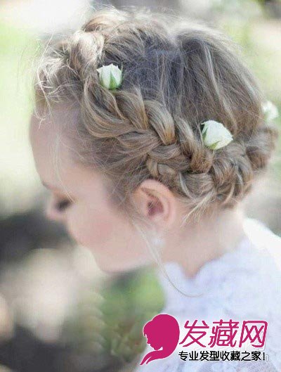 盘发+编发,夏季流行的扎法方式,一条沿头型扎起的辫子,点缀几个装饰,唯美浪漫。