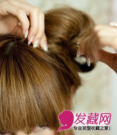 步骤六、再将简单盘好的马尾扎成一个花苞头的造型,用发夹固定。