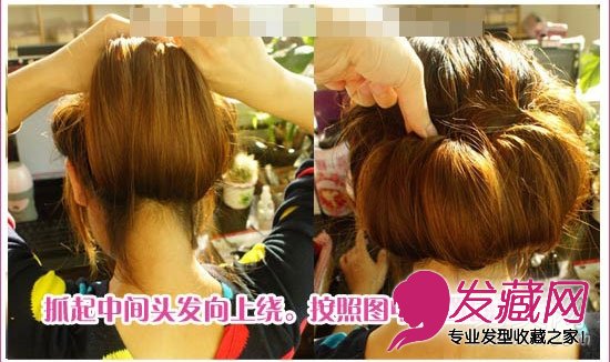 现在,将中间没有卷起的头发向上卷起,然后再用卡子固定住,如上图右侧所示。
