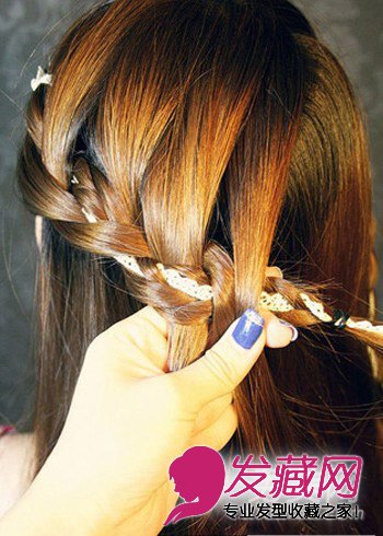 步骤5:要用斜编的方式哦,每隔两股麻花辫就增加一束发丝。