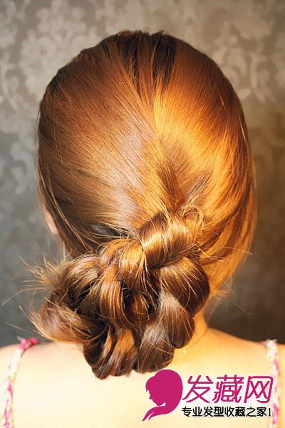 9,将编好的发辫沿着中心点,绕一圈,把发尾藏进发辫中去。