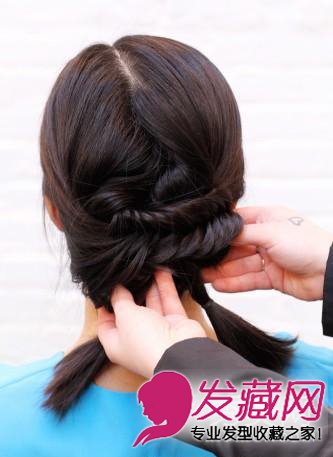 将左右两边的辫子彼此交叉,并且把多余的长发折叠起来压在辫子下方,拉紧,将发尾朝下留着。