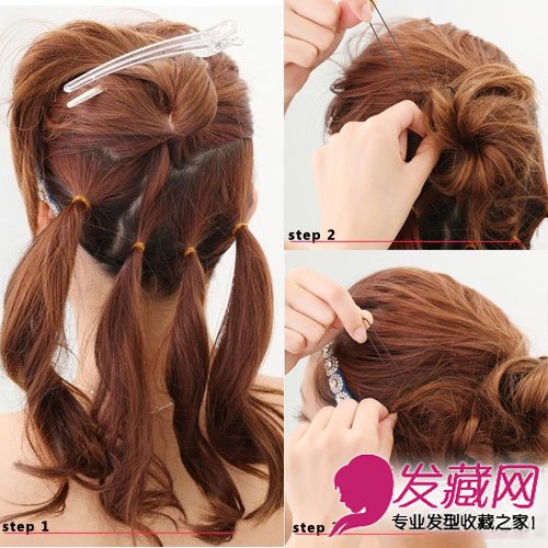 2. 用手将中心区域最大的发束进行拧卷,绕着一圈又一圈,造成一个漂亮的花苞,然后用U型夹进行固定。下面的小花苞也是这样拧卷而成的。