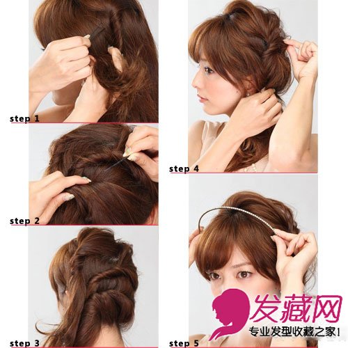 1. 全部头发梳向一边,分成三个部分,并将这三部分的头发拧起来。最上的一部分头发从右边向左边扭转发束。用与发色相近的发夹进行固定。