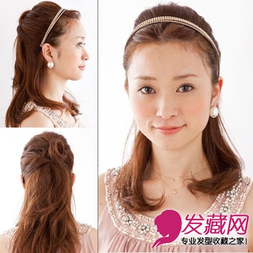 这款发型比起平时的发型稍微大胆一些,额头毫不遮掩全部露出来,这样的发型能突显MM自身的美哦。优雅细致的同时,闪闪发亮的发箍也塑造出可爱风格,头发后脑勺的地方轻轻拉出塑造立体感,可以对不是很饱满的头骨骼进行补正的效果哦。