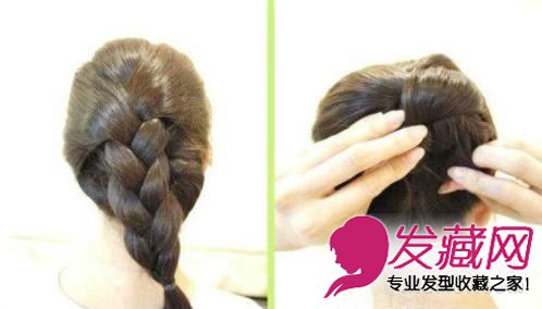 8.然后进行最关键的步骤了,把编好的麻花辫往里面卷起,收起来,效果如图所示,再用黑色的一字夹固定起来。