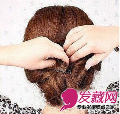 接下来要做的就是把编起来的的发尾的发束塞到上面刚才扎的发辫的那个洞里。
