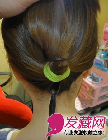 利用此工具,将头发全部从洞中穿过来(如果,没有工具就用最原始的办法。在皮筋处挖一个洞,然后把马尾辫发型整个穿过来)