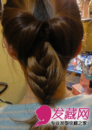 把穿过来的头发,编成鱼骨辫或是麻花辫的样子,用皮筋绑好