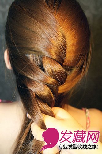就这样一直加入2边,新的头发,不停的扭转下去。其实跟蜈蚣辫的编法是一样的,只不过,由编麻花辫换成了扭辫子,也就是在每扭下一股的时候,分别从两旁各加进一束头发,以此类推