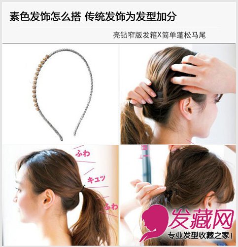 3、一手固定马尾,另一只手轻微拉扯头顶发丝,拉高整体发型,使之具有立体感和蓬松效果;并从马尾一侧抽取一缕发丝缠绕于发圈上,最后将发箍佩戴至头顶位置即可。