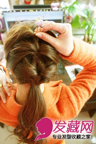 然后在头发都翻过来的3个皮筋处,都卡上好看的发卡