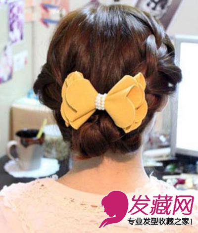 8、再用一个漂亮的蝴蝶结发饰夹在后面装饰。这样一个端庄优雅的韩式编发就编织好,挺简单的吧!