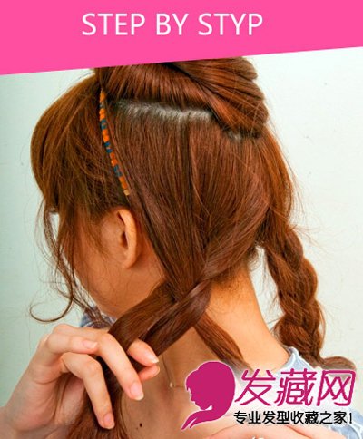Step4:按图中所示,将头发分成上、下两部分,下部分头发又分成均等两束,发布编织成宽松的麻花辫。