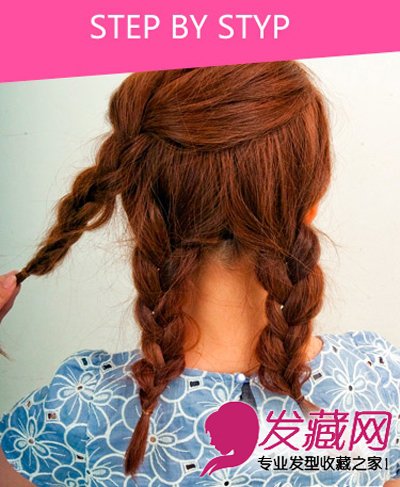Step5:松开头顶的发束,也编织成一条麻花辫,发尾用发带固定。