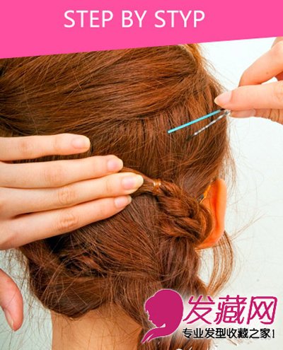 Step6:将左侧的辫子从右侧的辫子底下拉扯出来,再用发夹固定左侧辫子的发尾。