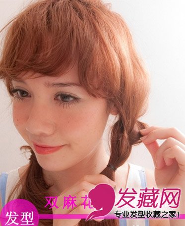 把两边头发分别编织成几股的麻花辫,在发尾的中间处用橡皮筋扎好,然后用手把一股股的麻花辫弄蓬松。