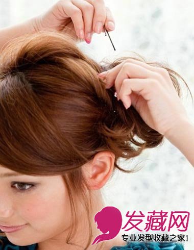 step3:把右边的的头发向左扭转,将发顶的头发拉松,用发夹固定到左边的马尾上。