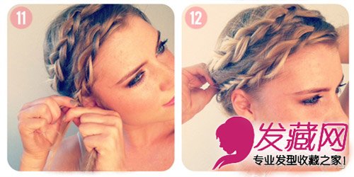 STEP 6 剩下的刘海部分也向右沿着发迹扎成麻花辫,再用发夹固定辫子尾部。