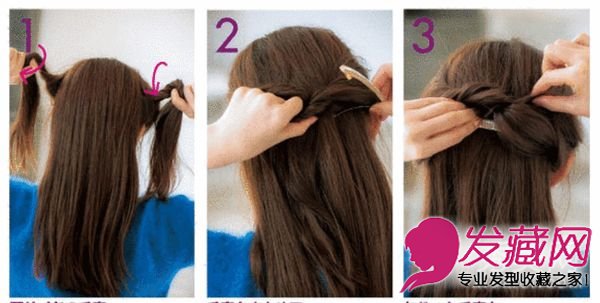 2、将两边的发束在后面像系口袋一样,交叉系好,再用发卡固定。