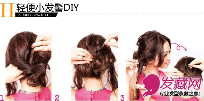 Step3:剩余的两边刘海,把它们分别扭转后绕到后面,在发髻处交叉固定。