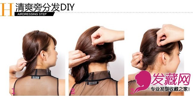 Step2:一边扭转一边加入后面的头发,最后用发夹在中间部位固定。