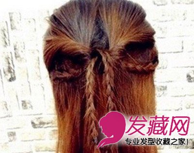 5、再用手抓住两条发辫的中部,从头顶的发束旋卷中穿过即可。