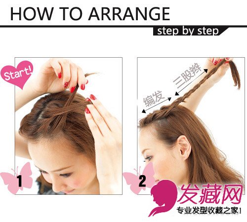 step 2:将头发编成向上的三股辫,另一边同样进行编发。(刚开始是采用3+2的编发,后面才是三股辫)