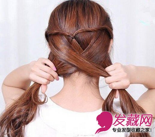 3、左边也按照上图的步骤,取出一半的头发搭在右半部分头发上。这样就分出了四股头发。