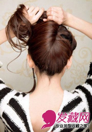 3、将后面剩余头发用手捋顺,然后往上方一扭,一手固定位置,一手盘起。