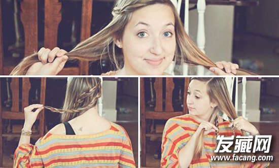 4:接着继续编织一个法式麻花辫。(注意:这一次的编织不需要松开压在辫子下面的头发)。