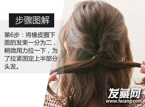 第6步:将橡皮圈下面的发束一分为二,稍微用力拉一下,为了拉紧固定上半部分头发。